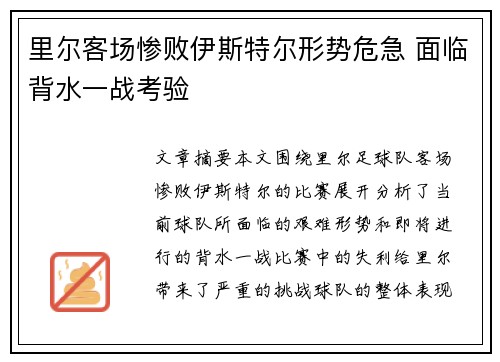 文章摘要:本文围绕里尔足球队客场惨败伊斯特尔的比赛展开,分析了当前球队所面临的艰难形势和即将进行的背水一战。比赛中的失利给里尔带来了严重的挑战,球队的整体表现和战术选择都暴露了不少问题,尤其是心理层面的脆弱和防守上的漏洞。本文将从四个方面详细阐述这场惨败的背景、影响、球队面临的困境以及如何应对即将到来的背水一战。第一部分将回顾比赛中的关键细节,第二部分探讨失利的原因和后果,第三部分分析里尔如何调整战术应对接下来的挑战,第四部分则讨论球队的心态和士气如何影响后续表现。最后,结合当前形势,提出里尔如何调整和反击的策略。