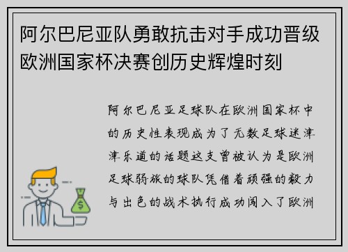 阿尔巴尼亚队勇敢抗击对手成功晋级欧洲国家杯决赛创历史辉煌时刻