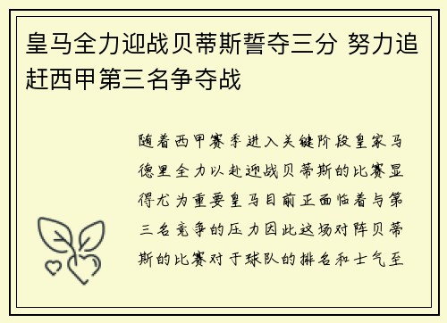 总的来说,随着西甲赛季进入白热化阶段,皇马的每场比赛都至关重要。若能够战胜贝蒂斯,并保持稳定的表现,球队将有机会在接下来的赛季中逆袭,继续向更高的排名发起冲击。所有的努力,都是为了最终实现赛季目标——争取西甲第三名,为下赛季的欧冠资格做足准备。